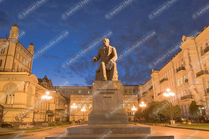Ночной Киев, Украина. Театр Оперы и Балета имени Лысенко. Памятник Николаю Лысенко - украинскому композитору, пианисту, хоровому дирижеру, фольклористу, педагогу, основоположнику национальной музыкальной школы
