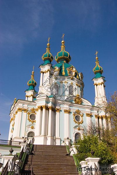 Киев, Украина. Андреевская церковь сооружена по проекту Бартоломео Растрелли в 1744-1767 годах в стиле барокко по заказу императрицы Елизаветы Петровны.