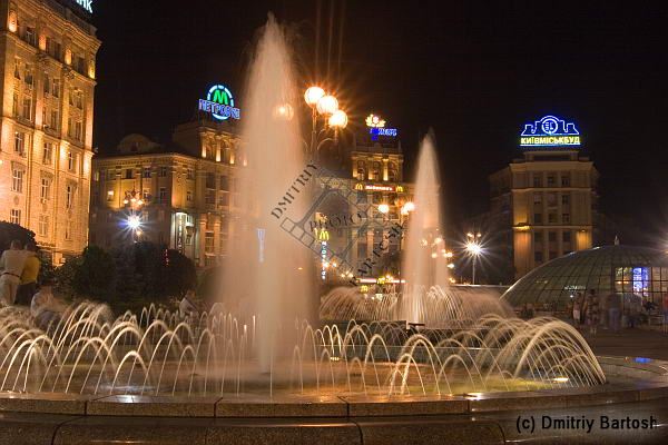 Ночной Киев, Украина. Фонтаны на плоащди Независимости