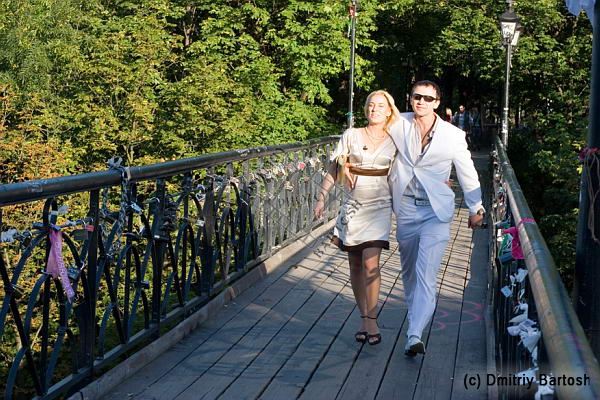 Киев, Украина. Влюбленная пара на мосте влюбленных