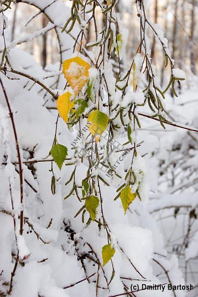 Киев, Украина. Листья березы в снегу. Парк Победы